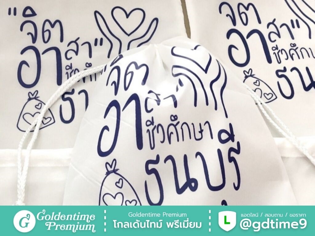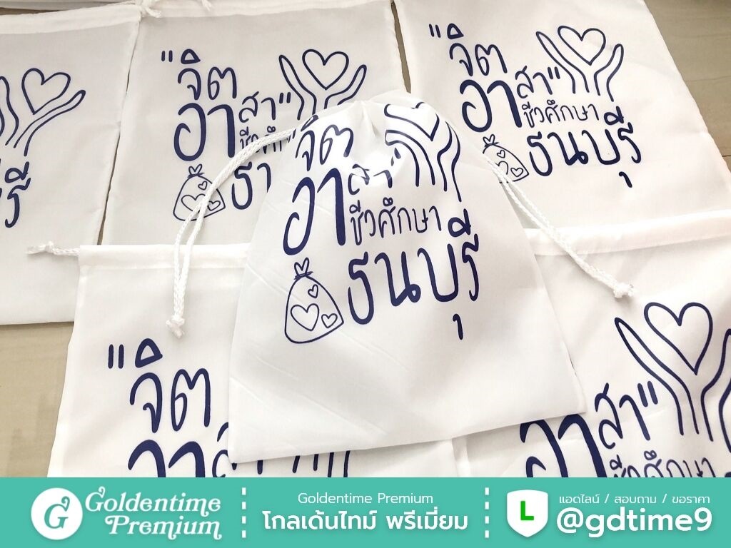 สั่งผลิตถุงผ้าร่มหูรูดโดยตรงจากโรงงาน โกลเด้นไทม์ พรีเมี่ยม ควบคุมคุณภาพทุกขั้นตอน ได้งานตรงแบบ ราคาคุ้มค่า พร้อมให้คำปรึกษาและเสนอราคา
